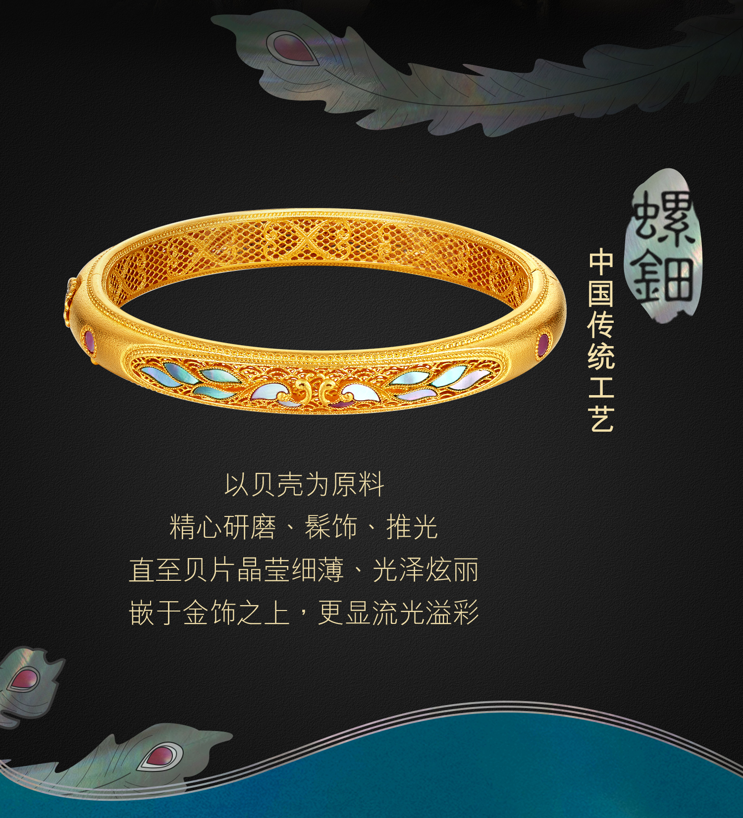 福满传家凤舞霓裳黄金手镯螺钿贝壳花丝计价