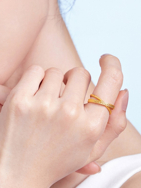 交叉叠戴,即选择具有交叉设计的戒指进行佩戴,如双环扣戒指等。这种款式的戒指本身就充满了设计感,佩戴起来既时尚又不失格调。它象征着环环相扣,永不分离的美好寓意。
